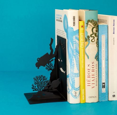 Praktisch, dekorativ und wiederstandsfähig ist diese tolle Buchstütze. Ideal um Bücher in einem Regal oder Schreibtisch zu organisieren und zu verhindern, dass sie umfallen. Das originelle Design verleiht jedem Raum eine lustige Note. Die Stütze zeigt einen Taucher mit tollem Unterwasserhintergrund, ein tolles Geschenk!