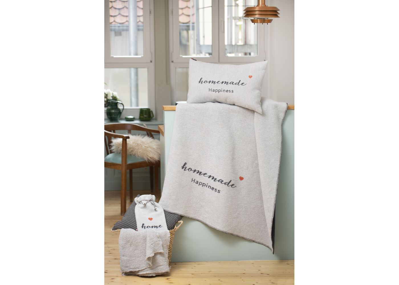 Kuschelig, weicher Kissenbezug mit der Aufschrift homemade Happiness, inklusive Füllkissen aus 100% Entenfedern, das sich leicht durch den einfachen Hotelverschluss tauschen lässt. Mit diesem Polster setzt man Akzente und liegt zugleich herrlich weich. Passend zur Wohndecke homemade.